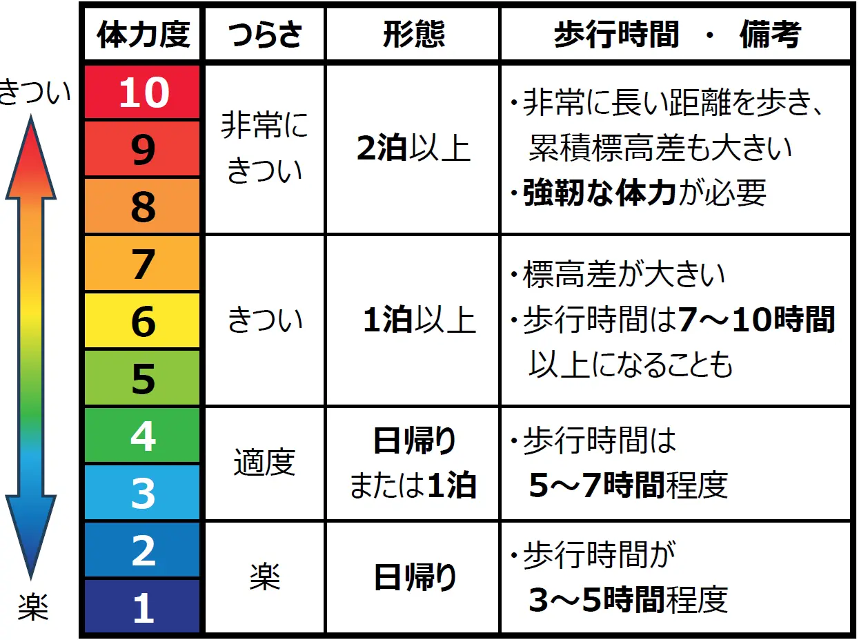 必要な体力を10段階で表したもの、10が最も体力が必要